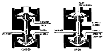 Figure 6-29.Three-way, poppet-type, normally closed directional control valve (pilot-operated). The poppets are actuated by cams on a camshaft (fig. 6-30). The camshaft is controlled by the movement of the handle. The valve may be operated by manually moving the handle, or, in some cases, the handle may be connected by mechanical linkage to a control handle which is located in a convenient place for the operator some distance from the valve.The camshaft may be rotated to any one of three positions (neutral and two working positions). In the neutral position the camshaft lobes are not contacting any of the poppets. This assures that the poppet springs will hold all four poppets firmly seated. With all poppets seated, there is no fluid flow through the valve. This also blocks the two cylinder ports; so when the valve is in neutral, the fluid in the actuating unit is trapped. Relief valves are installed in both working lines to prevent overpressurization caused by thermal expansion.NOTE: In some versions of this type of valve, the cam lobes are designed so that the two return/exhaust poppets are open when the valve is in the neutral position. This compensates for thermal expansion, because both working lines are open to the return/exhaust when the valve is in the neutral position.The poppets are arranged so that rotation of the camshaft will open the proper combination of poppets to direct the flow of fluid through the desired working line to an actuating unit. At the same time, fluid will be directed from the actuating unit through the opposite working line, through the valve, and back to the reservoir (hydraulic) or exhausted to the atmosphere (pneumatic).To stop rotation of the camshaft at an exact position, a stop pin is secured to the body and extends through a cutout section of the camshaft flange. This stop pin prevents overtravel by ensuring that the camshaft stops rotating at the point where the cam lobes have moved the poppets the greatest distance from their seats and where any further rotation would allow the poppets to start returning to their seats. O-rings are spaced at intervals along the length of the shaft to prevent external leakage around the ends of the shaft and internal leakage from one of the valve chambers to another. The camshaft has two lobes, or raised portions. The shape of these lobes is such that when the shaft is placed in the neutral position the lobes will not contact any of the poppets. When the handle is moved in either direction from neutral, the camshaft is rotated. This rotates