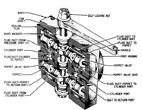 Poppet-Type Four-Way Valves Figure 6-30 shows atypical four-way, poppet-type directional control valve. This is a manually operated valve and consists of a group of conventional spring-loaded poppets. The poppets are enclosed in a common housing and are interconnected by ducts to direct the flow of fluid in the desired direction.