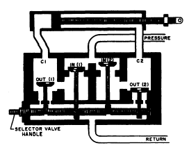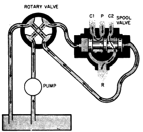 Figure 6-30.Cutaway view of poppet-type, four-way directional control valve. the lobes, which unseat one pressure poppet and one return/exhaust poppet (fig. 6-31). The valve is now in the working position. Fluid under pressure, entering the pressure port, flows through the vertical fluid passages in both pressure poppets seats. Since only one pressure poppet, IN (2), is unseated by the cam lobe, the fluid flows past the open poppet to the inside of the poppet seat. From there it flows through the diagonal passages, out one cylinder port, C2, and to the actuating unit. Return fluid from the actuating unit enters the other cylinder port, C1. It then flows through the corresponding fluid passage, past the unseated return poppet, OUT (1), through the vertical fluid passages, and out the return/exhaust port. When the camshaft is rotated in the opposite direction to the neutral position, the two poppets seat and the flow stops. When the camshaft is further rotated in this direction until the stop pins hits, the opposite pressure and return poppets are unseated. This reverses the flow in the working lines, causing the actuating unit to move in the opposite direction.Rotary Spool Valve Four-way directional control valves of this type are frequently used as pilot valves to direct flow to and from other valves (fig. 6-32). Fluid is directed from one source of supply through the rotary valve to another directional control valve, where it positions the valve to direct flow from another source to one side of an actuating unit. Fluid from the other end of the main valve flows through a return line, through the rotary valve to the return or exhaust port.The principal parts of a rotary spool directional control valve are shown in figure 6-22.