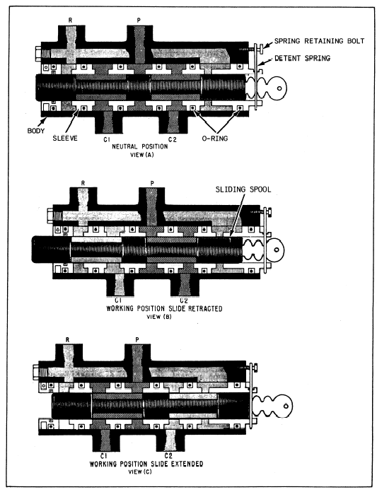 Figure 6-34.Operation of a sliding spool, four-way directional control valve. return/exhaust (R), and two cylinder ports (C/1 and C2). A hollow sleeve fits into the main bore of the body. There are O-rings placed at intervals around the outside diameter of the sleeve. These O-rings form a seal between the sleeve and the body, creating chambers around the sleeve. Each of the chambers is lined up with one of the fluid ports in the body. The drilled passage in the body accounts for a fifth chamber which results in having the two outboard chambers connected to the return/exhaust port. The sleeve has a pattern of holes drilled through it to allow fluid to flow from one port to another. A series of holes are drilled into the hollow center sleeve in each chamber.The sleeve is prevented from turning by a sleeve retainer bolt or pin which secures it to the valve body.The sliding spool fits into the hollow center sleeve. This spool is similar to the spool in the two-way valve, except that this spool has three pistons or lands. These lands are lapped or machine fitted to the inside of the sleeve. One end of the sliding spool is connected to a handle either directly or by mechanical linkage to a more desirable location. When the control handle is moved, it will position the spool within the sleeve. The lands of the spool then line up different combinations of fluid ports thus directing a flow of fluid through the valve. The detent spring is a clothespin-type spring, secured to the end of the body by a spring retaining bolt. The two legs of the spring extend down through slots in the sleeve and fit into the detents. The spool is gripped between the two legs of the spring. To move the spool, enough force must be applied to spread the two spring legs and allow them to snap back into the next detent, which would be for another position. Figure 6-34, view A, shows a manually operated sliding spool valve in the neutral position. The detent spring is in the center detent of the sliding spool. The center land is lined up with the pressure port (P) preventing fluid from flowing into the valve through this port. The return/exhaust port is also blocked, preventing flow through that port. With both the pressure and return ports blocked, fluid in the actuating lines is trapped. For this reason, a relief valve is usually installed in each actuating line when this type of valve is used.Figure 6-34, view B, shows the valve in the working position with the end of the sliding spool retracted. The detent spring is in the outboard detent, locking the sliding spool in this position. The lands have shifted inside the sleeve, and the ports are opened. Fluid under pressure enters the sleeve, passes through it by way of the drilled holes, and leaves through cylinder port C2. Return fluid, flowing from the actuator enters port C1, flows through the sleeve, and is directed out the return port back to the reservoir or exhausted to the atmosphere. Fluid cannot flow past the spool lands because of the lapped surfaces.Figure 6-34, view C, shows the valve in the opposite working position with the sliding spool extended. The detent spring is in the inboard detent. The center land of the sliding spool is now on the other side of the pressure port, and the fluid under pressure is directed through the sleeve and out port C1. Return fluid flowing in the other cylinder port is directed to the drilled passage in the body. It flows along this passage to the other end of the sleeve where it is directed out of the return/exhaust port.The directional control valves previously discussed are for use in closed-center fluid power systems. Figure 6-35 shows the operation of
