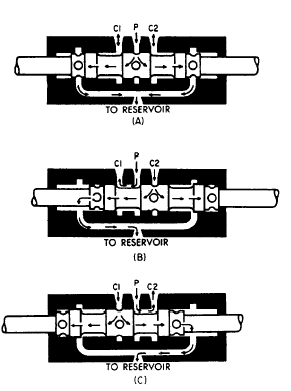 Figure 6-35.Open center, sliding spool directional control valve. a representative open-center, sliding spool directional control valve. When this type of valve is in the neutral position (fig. 6-35, view A), fluid flows into the valve through the pressure port (P) through the hollow spool, and return to the reservoir. When the spool is moved to the right of the neutral position, view B, one working line (C1) is aligned to system pressure and the other working line (C2) is open through the hollow spool to the return port. View C shows the flow of fluid through the valve with the spool moved to the left of neutral |
