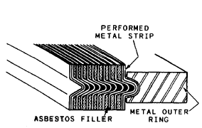 Figure 7-1.Spiral-wouna metallic-asbestos gasket. easily bent and requires careful handling. In addition, copper becomes hard when used over long periods and when subjected to compression. Whenever a unit or component is disassembled, the copper sealing rings should be replaced. However, if new rings are not available and the part must be repaired, the old ring should be softened by annealing. (Annealing is the process of heating a metal, then cooling it, to make it more pliable and less brittle.)Metallic piston rings are used as packing in some fluid power actuating cylinders. These rings are similar in design to the piston rings in automobile engines.Metal is also used with asbestos to form spiral-wound metallic-asbestos gaskets (fig. 7-1). These gaskets are composed of interlocked plies of preformed corrugated metal and asbestos strips, called a filler.The filler may or may not be encased in a solid metal outer ring. These gaskets are used in flanged connections and for connecting the body to the bonnet in some valves, and are usually required in specific high-pressure, high-temperature applications.RUBBER The term rubber and synthetic rubbers, covers many natural each of which can be compounded into numerous varieties. The characteristics of these varieties have a wide range, as shown in table 7-1. The table shows, with the exception of a few basic similarities, that rubbers have diverse properties and limitations; therefore, specific applications require careful study before the sealing material is selected.Natural rubbers have many of the charac-teristics required in an effective seal. However, their very poor resistance to petroleum fluids and rapid aging when exposed to oxygen or ozone limit their use. Today their use has almost ceased. There are two general classes of synthetic rubber seals. One class is made entirely of a certain synthetic rubber. The term homogeneous, which means having uniform structure or composition throughout, is frequently used to describe this class of seal. The other class of seal is made by impregnating woven cotton duck or fine-weave asbestos with synthetic rubber. This class is sometimes referred to as fabricated seals. Additional information on sealing materials is provided in the Military Handbook, Gasket the Naval Ships Technical Manual, chapter 078. |