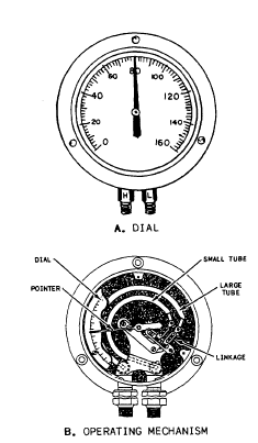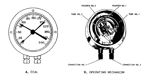 Figure 8-3.Bourdon-tube differential pressure gauge. example, some hydraulic gauges have a special type of spring-loaded linkage that is capable of taking overpressure and underpressure without damage to the movement and that keeps the pointer from slamming back to zero when the pressure is suddenly changed. A hydraulic gauge that does not have such a device must be protected by a suitable check valve. Some hydraulic gauges may also have special dials that indicate both the pressure (in psi) and the corresponding total force being applied, for example tons of force produced by a hydraulic press.Spiral and Helical Bourdon Tubes Spiral and helical Bourdon tubes (figs. 8-4 and 8-5) are made from tubing with a flattened cross