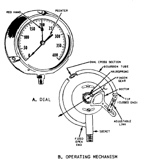 Figure 8-1.Simplex Bourdon-tube pressure gauge. C-shaped Bourdon Tube The C-shaped Bourdon tube has a hollow, elliptical cross section. It is closed at one end and is connected to the fluid pressure at the other end. When pressure is applied, its cross section becomes more circular, causing the tube to straighten out, like a garden hose when the water is first turned on, until the force of the fluid pressure is balanced by the elastic resistance of the tube material. Since the open end of the tube is anchored in a fixed position, changes in pressure move the closed end. A pointer is attached to the closed end of the tube through a linkage arm and a gear and pinion assembly, which rotates the pointer around a graduated scale.Bourdon-tube pressure gauges are often classified as simplex or duplex, depending upon whether they measure one pressure or two pressures. A simplex gauge has only one Bourdon tube and measures only one pressure. The pressure gauge shown in figure 8-1 is a simplex gauge. A red hand is available on some gauges. This hand is manually positioned at the maximum operating pressure of the system or portion of the system in which the gauge is installed.When two Bourdon tubes are mounted in a single case, with each mechanism acting independently but with the two pointers mounted on a common dial, the assembly is called a duplex gauge. Figure 8-2 shows a duplex gauge with views of the dial and the operating mechanism. Note that each Bourdon tube has its own pressure connection and its own pointer. Duplex gauges are used to give a simultaneous indication of the pressure from two different locations. For example, it may be used to measure the inlet and outlet pressures of a strainer to obtain the differential pressure across it.Differential pressure may also be measured with Bourdon-tube gauges. One kind of Bourdon-tube differential pressure gauge is shown in figure 8-3. This gauge has two Bourdon tubes but only one pointer. The Bourdon tubes are connected in such a way that they indicate the pressure difference, rather than either of two actual pressures.As mentioned earlier, Bourdon-tube pressure gauges are used in many hydraulic systems. In this application they are usually referred to as hydraulic gauges. Bourdon-tube hydraulic gauges are not particularly different from other types of Bourdon-tube gauges in how they operate; however, they do sometimes have special design features because of the extremely high system pressures to which they may be exposed. For