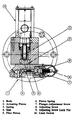 Figure 8-9.Typical pressure switch. case that has a removable cover, an electrical connection, and a pressure-sensing connection. The switch contains a seamless metallic bellows located in its housing. Changes in the measured pressure causes the bellows to work against an adjustable spring. This spring determines the pressure required to actuate the switch. Through suitable linkage, the spring causes the contacts to open or close the electrical circuit automatically when the operating pressure falls below or rises above a specified value. A permanent magnet in the switch mechanism provides a positive snap on both the opening and closing of the contacts. The switch is constantly energized. However, it is the closing of the contacts that energizes the entire electrical circuit.Another pressure switch is an electric-hydraulic assembly that is used for shutting off the pumps motor whenever the system pressure exceeds a pre-determined maximum value (fig. 8-10). The switch is mounted on the pump housing so that the formers low pressure ports drain directly into the pump housing. This pressure switch principally consists of a flange-mounted hydraulic valve to which is fixed a normally closed electrical limit switch. The valve consists of two hydraulically interconnected components, the pilot valve sub-assembly, which bolts on the bottom of the body (l), functions to sense system pressure continuously and initiates pressure switch action whenever this pressure exceeds the adjusted setting of the pilot adjustment. System pressure is directed into the bottom port and is applied against the exposed tip of the pilot piston (5). This piston is held on its seat by compression from the piston spring (6) which is dependent on the position of the adjusting screw (8). Whenever the pressure causes a force sufficiently large enough to raise the pilot piston from its seat, fluid flows through an interconnecting passage to the actuating piston (2) chamber. The accompanying fluid force raises the actuating piston against the force of spring 3 and causes depression of the extended switch plunger. This, in turn, disconnects the contained electrical switch, which may be connected into the pump motors electric supply system.Pressure switches come in many sizes and configurations depending on how they will be used.