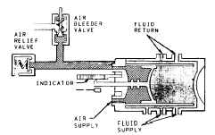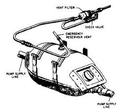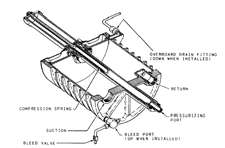 Figure 9-2.Nonpressurized aircraft reservoir. The quantity of fluid in the reservoir is indicated by either a glass tube, a directing gauge, or a float-type rod, which is visible through a transparent dome installed on the reservoir. PRESSURIZED RESERVOIRS A pressurized reservoir is required in hydraulic systems where atmospheric pressure is insufficient to maintain a net positive suction head (NPSH) to the pump. There are two common types of pressurized reservoirsfluid-pressurized and air-pressurized. Fluid-Pressurized Reservoir Some aircraft hydraulic systems use fluid pressure for pressurizing the reservoir. The reservoir shown in figure 9-3 is of this type. This reservoir is divided into two chambers by a floating piston. The piston is forced downward in the reservoir by a compression spring within the pressurizing cylinder and by system pressure entering the pressurizing port of the cylinder. The pressurizing port is connected directly to the pressure line. When the system is pressurized, pressure enters the pressure port, thus pressurizing the reservoir. This pressurizes the pump suction line and the reservoir return line to the same pressure. The reservoir shown in figure 9-3 has five portspump suction, return, pressurizing, overboard drain, and bleed. Fluid is supplied to the pump through the pump suction port. Fluid returns to the reservoir from the system through the return port. Pressure from the pump enters the pressurizing cylinder in the top of the reservoir through the pressurizing port. The overboard drain port is used to drain the reservoir while performing maintenance, and the bleed port is used as an aid when servicing the reservoir. Air-Pressurized Reservoirs Air-pressurized reservoirs, such as the one shown in figure 9-4, are currently used in many high-performance naval aircraft. The reservoir is cylindrical in shape and has a piston installed internally to separate the air and fluid chambers. Air pressure is usually provided by engine bleed air. The piston rod end protrudes through the reservoir end cap and indicates the fluid quantity. The quantity indication may be seen by inspecting the distance the piston rod protrudes from the reservoir end cap. The reservoir is provided with