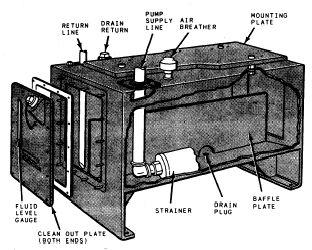 CHAPTER 9 Fluid power systems must have a sufficient and continuous supply of uncontaminated fluid to operate efficiently. As stated in chapter 3 and emphasized throughout this manual, the fluid must be kept free of all foreign matter. This chapter covers hydraulic reservoirs, various types of strainers and filters, and accumulators installed in fluid power systems. RESERVOIRS A hydraulic system must have a reserve of fluid in addition to that contained in the pumps, actuators, pipes, and other components of the system. This reserve fluid must be readily available to make up losses of fluid from the system, to make up for compression of the fluid under pressure, and to compensate for the loss of volume as the fluid cools. This extra fluid is contained in a tank usually called a reservoir. A reservoir may sometimes be referred to as a sump tank, service tank, operating tank, supply tank, or base tank. In addition to providing storage for the reserve fluid needed for the system, the reservoir acts as a radiator for dissipating heat from the fluid and as a settling tank where heavy particles of contamination may settle out of the fluid and remain harmlessly on the bottom until removed by cleaning or flushing of the reservoir. Also, the reservoir allows entrained air to separate from the fluid. Most reservoirs have a capped opening for filling, an air vent, an oil level indicator or dip stick, a return line connection, a pump inlet or suction line connection, a drain line connection, and a drain plug (fig. 9-1). The inside of the reservoir generally will have baffles to prevent excessive sloshing of the fluid and to put a partition between the fluid return line and the pump suction or inlet line. The partition forces the returning fluid to travel farther around the tank before being drawn back into the active