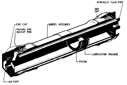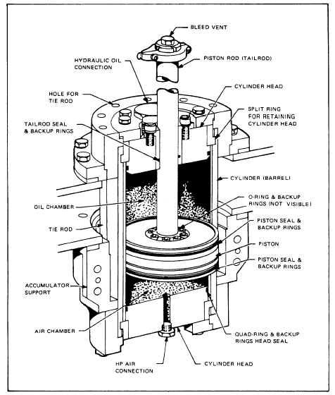 Figure 9-5.Cross-section view of a piston-type accumulator with a tailrod. and the system pressure can be maintained within an acceptable range for long periods of time. Accumulators also compensate for thermal expansion and contraction of the liquid due to variations in temperature. A liquid, flowing at a high velocity in a pipe will create a backward surge when stopped suddenly by the closing of a valve. This sudden stoppage causes instantaneous pressures two to three times the operating pressure of the system. These pressures, or shocks, produce objectional noise and vibrations which can cause considerable damage to piping, fittings, and components. The incorporation of an accumulator enables such shocks and surges to be absorbed or cushioned by the entrapped gas, thereby reducing their effects. The accumulator also dampens pressure surges caused by pulsating delivery from the pump. There are times when hydraulic systems require large volumes of liquid for short periods of time. This is due to either the operation of large cylinders or the necessity of operating two or more circuits simultaneously. It is not economical to install a pump of such large capacity in the system for only intermittent usage, particularly if there is sufficient time during the working cycle for an accumulator to store up enough liquid to aid the pump during these peak demands. The energy stored in accumulators maybe also used to actuate hydraulically operated units if normal hydraulic system failure occurs. Four types of accumulators used in Navy hydraulic systems are as follows: 1. Piston type 2. Bag or bladder type 3. Direct-contact gas-to-fluid type 4. Diaphragm type PISTON-TYPE ACCUMULATORS Piston-type accumulators consist of a cylindrical body called a barrel, closures on each end called heads, and an internal piston. The piston may be fitted with a tailrod, which extends through one end of the cylinder (fig. 9-5), or it may not have a tailrod at all (fig. 9-6). In the latter case, it is referred to as a floating piston. Hydraulic fluid is pumped into one end of the cylinder and the piston is forced toward the opposite end of the cylinder against a captive