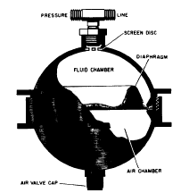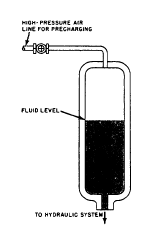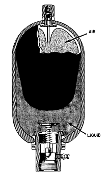Figure 9-7.Bladder-type accumulator. the accumulator. Consequently, the bladder accumulator has a very high volumetric efficiency. In other words, this type of accumulator is capable of supplying a large percentage of the stored fluid to do work. The bladder is precharged with air or inert gas to a specified pressure. Fluid is then forced into the area around the bladder, further compressing the gas in the bladder. This type of accumulator has the advantage that as long as the bladder is intact there is no exposure of fluid to the gas charge and therefore less danger of an explosion. DIRECT-CONTACT GAS-TO-FLUID ACCUMULATORS Direct-contact gas-to-fluid accumulators generally are used in very large installations where it would be very expensive to require a piston-or bladder-type accumulator. This type of accumulator consists of a fully enclosed cylinder, mounted in a vertical position, containing a liquid port on the bottom and a pneumatic charging port at the top (fig. 9-8). This type of accumulator is used in some airplane elevator hydraulic systems where several thousand gallons of fluid are needed to supplement the output of the hydraulic pumps for raising the elevator platform. The direct contact between the air or gas and the hydraulic fluid tends to entrain excessive amounts of gas in the fluid. For this reason, direct contact accumulators are generally not used for pressures over 1200 psi. The use of this type of accumulator with flammable fluid is dangerous because there is a possibility of explosion if any oxygen is present in the gas, and pressure surges generate excessive heat. For this reason, safety fluids are used in this type of installation. DIAPHRAGM ACCUMULATORS The diaphragm-type accumulator is constructed in two halves which are either screwed or bolted together. A synthetic rubber diaphragm is installed between both halves, making two chambers. Two threaded openings exist in the assembled component. The opening at the top, as shown in figure 9-9, contains a screen disc which prevents the diaphragm from extruding through the threaded opening when system pressure is depleted, thus rupturing the diaphragm. On some designs the screen is replaced by a button-type protector fastened to the center