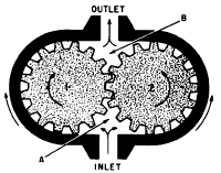 Figure 10-11.Applications of actuating cylinders. MOTORS A fluid power motor is a device that converts fluid power energy to rotary motion and force. The function of a motor is opposite that of a pump. However, the design and operation of fluid power motors are very similar to pumps. Therefore, a thorough knowledge of the pumps described in chapter 4 will help you understand the operation of fluid power motors. Motors have many uses in fluid power systems. In hydraulic power drives, pumps and motors are combined with suitable lines and valves to form hydraulic transmissions. The pump, commonly referred to as the A-end, is driven by some outside source, such as an electric motor. The pump delivers fluid to the motor. The motor, referred to as the B-end, is actuated by this flow, and through mechanical linkage conveys rotary motion and force to the work. This type of power drive is used to operate (train and elevate) many of the Navys guns and rocket launchers. Hydraulic motors are commonly used to operate the wing flaps, radomes, and radar equipment in aircraft. Air motors are used to drive pneumatic tools. Air motors are also used in missiles to convert the kinetic energy of compressed gas into electrical power, or to drive the pump of a hydraulic system. Fluid motors may be either fixed or variable displacement. Fixed-displacement motors provide constant torque and variable speed. The speed is varied by controlling the amount of input flow. Variable-displacement motors are constructed so that the working relationship of the internal parts can be varied to change displacement. The majority of the motors used in fluid power systems are the fixed-displacement type. Although most fluid power motors are capable of providing rotary motion in either direction, some applications require rotation in only one direction. In these applications, one port of the motor is connected to the system pressure line and the other port to the return line or exhausted to the atmosphere. The flow of fluid to the motor is controlled by a flow control valve, a two-way directional control valve, or by starting and stopping the power supply. The speed of the motor may be controlled by varying the rate of fluid flow to it. In most fluid power systems, the motor is required to provide actuation power in either direction. In these applications the ports are referred to as working ports, alternating as inlet and outlet ports. The flow to the motor is usually controlled by either a four-way directional control valve or a variable-displacement pump. Fluid motors are usually classified according to the type of internal element, which is directly actuated by the flow. The most common types of elements are the gear, the vane, and the piston, AU three of these types are adaptable for hydraulic systems, while only the vane type is used in pneumatic systems. GEAR-TYPE MOTORS The spur, helical, and herringbone design gears are used in gear-type motors. The motors use external-type gears, as discussed in chapter 4. The operation of a gear-type motor is shown in figure 10-12. Both gears are driven gears; however, only one is connected to the output shaft. As fluid under pressure enters chamber A, it takes the path of least resistance and flows around the inside surface of the housing, forcing the gears to rotate as indicated. The flow continues through the outlet port to the return. This rotary motion of the gears is transmitted through the attached shaft to the work unit. The motor shown in figure 10-12 is operating in one direction; however, the gear-type motor is capable of providing rotary motion in either direction. To reverse the direction of rotation, the ports may be alternated as inlet and outlet. When fluid is directed through the outlet port (fig. 10-12) into chamber B, the gears rotate in the opposite direction.
