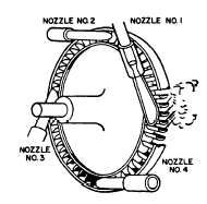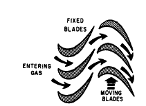 Figure 10-17 .Impulse turbine. the stator (casing) in which the rotor revolves. The fixed blades guide the gas into the moving blade system and, since they are also shaped and mounted to provide nozzle-shaped spaces between the blades, the freed blades also act as nozzles. A reaction turbine is moved by three main forces: (1) the reactive force produced on the moving blades as the gas increases in velocity as it expands through the nozzle-shaped spaces between the blades; (2) the reactive force produced on the moving blades when the gas changes direction; and (3) the push or impulse of the gas impinging upon the blades. Thus, as previously noted, a reaction turbine is moved primarily by reactive force but also to some extent by direct impulse. Impulse and reaction blades can be combined to form an impulse-reaction turbine. This turbine combines the rotational forces of the previously described turbines; that is, it derives its rotation from both the impulse of the gas striking the turbine blades and the reactive force of the gas changing direction.