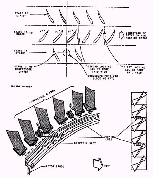 Figure 2-10.- Zero indexing the compressor rotor. damage. Beginning with the third stage, if a slight tilting of the blade or raising of the blade platform is observed, suspect blade root failure. This condition requires suspended engine operation until the condition has been evaluated COMPRESSOR DAMAGE.- In tie following paragraphs, redescribe some of the damage you may find during an engine inspection. You can find the condition codes used to describe engine damage in foldout table 2-1. Airfoil and Tip Cracks.- Cracks in the compressor hardware are difficult to detect because they are tight and shallow in depth. You can miss these subtle efects because of deteriorated borescope optics or if you rotate the rotor too fast. You should record all crack information relative to the stage, area, magnitude, direction, and adjacent blade condition. Cracked Dovetail.- A cracked dovetail of a blade may lead to blade loss. The location of the blade will determine the extent of engine damage. Before the actual catastrophic failure of the blade, the separated crack in the dovetail will be evident by a leaning blade platform. You can find this fault by using the borescope to inspect each blade platform. The leaning blade platform will be higher than the adjacent nonleaning blades. e A "leaner" is a blade that has a crack on the aft ide of the dovetail and is leaning in the forward direction (fig. 2-12). If a leaner is detected, it must be verified and the engine should be removed from service. Airfoil and Tip Tears.- The most critical area of a torn blade is the area around the end of the tear and its location on the airfoil. You should inspect this area for cracks that lead from the tear and are susceptible to propagation. This condition could lead to the loss of the airfoil section that would create downstream impact damage. You should record all information such as stage, blade locations, area of the blade in which the defect was found, and the condition of the rest of the airfoil and adjacent airfoils. Section A of figure 2-11 shows the nomenclature of a blade. Leading and Trailing Edge Damage.- Random impact damage can be caused throughout the compressor rotor stages by FOD and DOD. The leading and trailing edge of an airfoil is the area of the compressor blade extending from the edge into the irfoil. You must assess both sides or faces of the airfoil when determining the extent of a given defect. If you observe a defect, estimate the percentage of damaged chord length. Observe the defect and the condition of the airfoil area around the defect. If the observed damage is assessed to be "object damage," the most difficult determination is the differentiation between cracks, scratches, and marks made by the passing objects. Cracks are usually tight in the airfoils, but the apex of the damage usually allows viewing into the airfoil thickness. This provides a direct inspection of the area around the crack You may have to use all the probes at varying light levels to determine the extent of the damage. Tip Curl.- Compressor rotor blade tip curl is a random and infrequent observation. tip curl is usually the result of blade rub on the compressor case. Tip curl also can be the result of objects being thrown to the outer circumferential area of the flow path and then being impacted by the rotating blade tip (either leading or