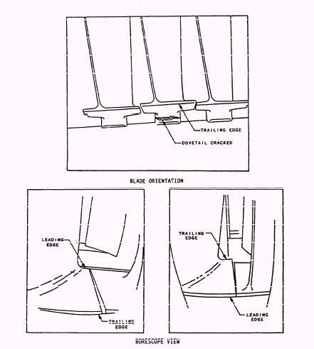 Figure 2-12.- Compressor blade leaners. trailing edge). These curled tips are usually smooth in the bend area of the airfoil distortion. However, you should inspect the area at the change in normal airfoil for tears or cracks. When you report tip curl, estimate he percent of the chord length, the number of blades with curl, and the condition of the adjacent airfoil area. Record any evidence of impact and inspect for the origin of the impact. Always look at the adjacent blades for evidence of tip clang. Missing Metal.- Missing metal from compressor rotor blade airfoils is a result of the progression of cracked or tom airfoils that release part of the airfoil into the flow path. Crack propagation in the root fillet area can result in the separation of the entire blade. Severe FOD or DOD may result in several random rotor and stator airfoils with missing metal. The inspection report hould include the stage, the number of blades with missing metal, the amount, and the location on the airfoil. Estimate the percent of chord, the span of the airfoil that is missing metal, and the condition of the remaining airfoil. |