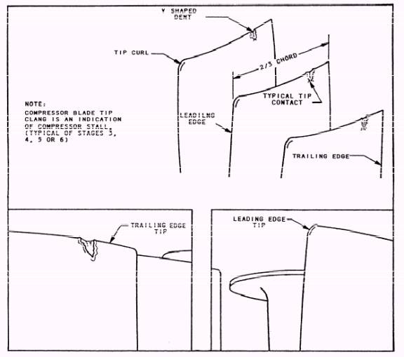 Airfoil Surface Defects.- Surface defects are the result of object damage or adjacent blade interference (tip clang). Impacts in the center section of the airfoil are not common. Tip clang damage is the result of a blade leading edge tip contacting the adjacent blade tip at approximately one-third of the chord length forward of the trailing edge on the low-pressure (convex) side of the blade (fig. 2-13). This is the result of compressor stall and is observed in stages 3 through 6. You should report any observed defect on the airfoil surfaces in the inspection record. Your report should contain