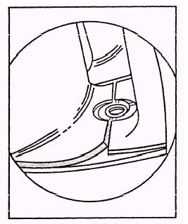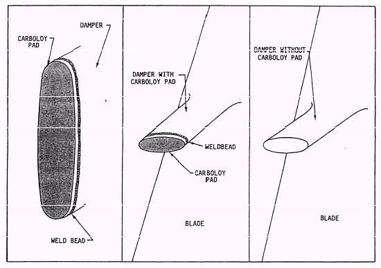 Figure 2-17.- Compressor blade midspan damper carboloy pad. shrouding over the blade tips and the rotor drum area under the stator vanes. tip rubs of either the blades or the vanes will rub off the aluminum coating. As time is accrued on the compressor assembly, the after stages of the rotor release or flake the aluminum coating. This deterioration is a normal progression. Flaking occurs because of the differences in thermal expansion of dissimilar metals and the differences in the size and configuration of the various parts. The released aluminum flakes enter the airstream, impact the rotor blades or vanes, and splatter the airfoils. Aluminum splatter observed forward of stage 11 can be caused by object damage or aluminum flakes that are rubbed out of the compressor case coating. This condition requires a thorough inspection of the forward compressor stages. |