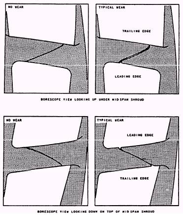 Figure 2-15.- Platform bowing. The spacing of the blade numbers separating the shingled blade platforms he platform gap observation (estimate gap as percent of circumferential span of the platform) he condition of the shingled edge (bent, fretted, or stepped as per table 2-1) Midspan Shroud Wear.- Some stage 1 compressor blades show wear at the mating surfaces of the midspan damper shrouds. (See figs. 2-16 and 2-17.) Wearing of the tungsten-carbide wear coat causes the mating face contour to change from a straight line to a stepped line. This occurs at the after edge of the clockwise blade midspan (trailing edge) and the forward edge of the counterclockwise blade midspan shroud (leading edge). In the step area, some metal maybe turned or protruding from the midspan shroud mating line (mushrooming). This protrusion is indicative of wear-through. A missing pad on one face would initiate an accelerated failure of the mating surfaces. BLADE DEPOSITS.- Compressor blades and stator vanes exhibit varying degrees of cleanliness. Variables such as air-inlet configuration, ambient atmospheric conditions, and air contaminants (chemicals, salt, dirt, water, and so forth) all tend to affect the surface condition of the compressor rotor and stator blades. Aluminum Deposits.- Two areas in the compressor assembly are coated with aluminum, the