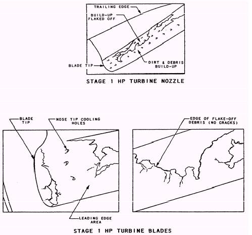 Figure 2-26.- HP turbine blade flaking and buildup. Record the magnitude and span location relative to the number of gill holes spanned. Estimate the out of contour as percent of the leading edge frontal area width or relative to the lateral spanning of the leading edge cooling hole rows. Blade Tip Nibbling.- The HP turbine rotor stage 1 blade tip nibbling is associated with hot running engines. Momentary overtemperature operation (such as experienced during compressor stalls) has exhibited this type of deterioration. This area of the blade is above the tip cap and located about two-thirds of the chord aft from the leading edge. Figure 2-27 shows a typical "nibbled tip" as a result of a severe stall.