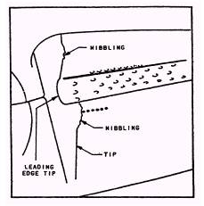 Figure 2-27.- HP turbine blade tip nibbling. convex or concave airfoil surface, the damage can be severe. HP Turbine Blade Coating Failure.- The HP turbine protective coating is the key factor in the service