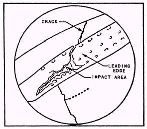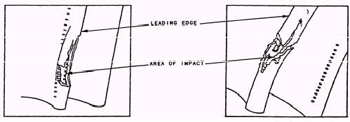 Distortion. - Heavy impact damage to the leading edge of the blade usually results in distortion. When the impact is severe enough, cracking and/ or tearing of the leading edge, adjacent to the impact area, occurs.