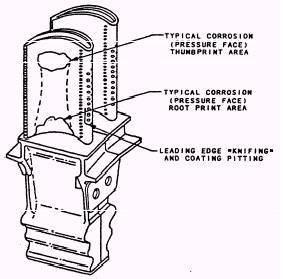 Figure 2-30.- HP turbine rotor stage 1 blade- areas of severe corrosion after extensive operating time. blading presently have blade coating BC21. As they become serviceable by an area Naval Aviation Depot (NADEP) these blades will be replaced with blades coated with BC23. Use of these newer blade coatings can significantly extend blade service life. HP TURBINE BLADE FAILURE MODES.- Failures that you may observe during a borescope inspection include the following types: l Corrosion of the coating. This appears as pitting of the coating primarily in the 80-percent span midchord region of the concave airfoil (thumbprint) side and the 20-percent span midchord region (root print) (fig. 2-30). This corrosion/ erosion has not been found on blades coated with BC23.