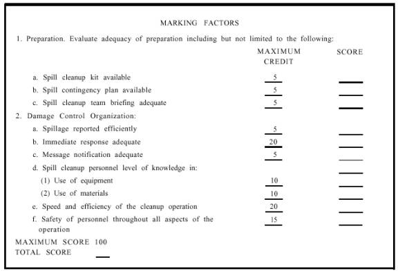Figure 1-3 is a sample of a training drill scenario and evaluation sample for a gasoline spill drill. This scenario, like all others, should be tailored to meet the needs of your ship. The purpose of this sample is to provide you, the supervisor, a practical way to initiate the drill and to monitor and evaluate your response team's abilities. Keep in mind, the maximum credit points are arbitrary. You should assign point values based on the importance of each task being performed.