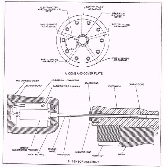 Figure 3-11.- Hub-mounted electronic pitch position transducer. transducer excitation and output coils. The rotating electronics cylinder rectifies the rotary transformer excitation to 24 V dc for powering the hub-mounted transducer and receives the transducer output. The rotating electronics cylinder is attached to the prairie air tube extension at the end of the OD box. The cylinder electronically regulates the transducer output to -3 kHz for the rotary transformer. For a more detailed description of this system's operation, consult the DDG-51 propulsion plant manual or the DDG-51 CPP system technical manual. |