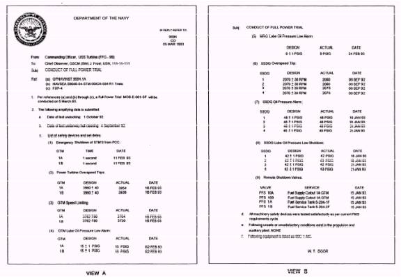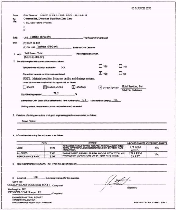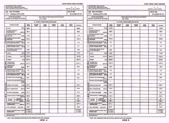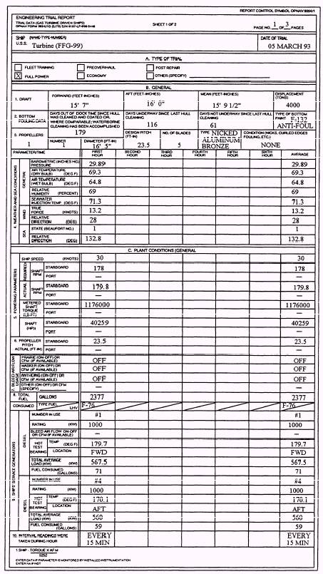 PROCESSING.- Feedbacks are processed as quickly as possible. Generally, the more compre-hensively prepared a feedback is, the easier it is to answer. Do all the homework you can before submitting a feedback. 1 . C a t e g o r y A f e e d b a c k s a r e s e n t to NAVWARCENSSES. The items requested are forwarded within 21 working days of the request receipt. 2. Category B feedbacks are screened by the TYCOM and may be answered by them and returned to you. This could occur when your recommended change is not according to their policy or EOSS program policy. When your T Y C O M f o r w a r d s t h e f e e d b a c k to NAVWARCENSSES, there are three possible responses. a. Concur- Advance copies of the revised document( s) will be forwarded. b. Do not concur- An explanation of the reason for nonconcurrence will be c. forwarded within 21 working days of receipt. Other- Advance and final copies will be forwarded as with concur items. An explanation of the partial concurrence will accompany the advance copies. 3. Annotations for routine feedbacks are limited to documenting authorized configuration changes. Routine procedural/ parameter pen and ink changes are not authorized. Make Local Changes to Manuals L o c a l c h a n g es to EOSS are NOT AUTHORIZED except as described in section 4 of chapter 1 of the EOSS User's Guide. Only NAV-WARCENSSES can approve and issue changes to the NAVSEA-installed EOSS. PREPARE FULL POWER AND ECONOMY TRIAL REPORTS As a GS supervisor, full power and economy trials will be a very important part of your responsibilities. Through proper leadership and training these trials can be proof of your management skills. They are proof of your ability to maintain your propulsion equipment at peak levels of performance. Although FXP-4 mobility (MOB) exercises delineate general requirements for conducting engineering trials, inconsistencies have developed among different naval commands in levying different requirements for full power and economy trials for nonnuclear surface ships. Full power and economy trial requirements are based partially on calculations and partially on design requirements. It is not economically feasible to conduct full-scale trials to document every possible condition. Therefore, to avoid confusion, the reporting system for trial results is found in OPNAVINST 9094.1, Full Power and Economy Trial Requirements for Non-nuclear Surface Ship Classes. In this section we will briefly discuss the performance of these trials and the processing of data needed to complete the required reports. FULL POWER TRIALS A full power trial must be conducted annually for a minimum duration of one hour and at a minimum depth of water as prescribed in NSTM, chapter 094. All full power trials shall be conducted with a minimum 75 percent liquid load at the commencement of the trial. During the trials, fleet and type commanders must ensure machinery alignments are according to heat balance diagrams, propulsion operating guides, and applicable technical documentation. Compile Information The information compiled during the full power trial must be entered on standard forms used for all gas turbine-powered ships. All the following forms except the one shown in figure 1-9 are available through normal supply channels according to NAVSUP P-2002. Figure 1-6 is the trial transmittal letter (cover sheet), OPNAV form 9094/ 1A, NSN 0107-LF-090-9405. Figure 1-7 is sheet 1 of 2 of the trial data form, OPNAV form 9094/ 1D, NSN 0107-LF-090-9440. Figure 1-8 is sheet 2 of 2 of the trial data form, OPNAV form 9094/ 1D, NSN 0107-LF-090-9445. View A shows plant condition data for 1A GTE, while view B shows data for 1B GTE. The form shown in figure 1-9 is not available in the supply system, but it is the standard format used to report the actual propulsion plant condition to the chief observer before a full power or even an economy trial commences. Disseminate Information For you to properly disseminate the information, you must be familiar with all operating characteristics of your plant. In other words, you need to go back to the basics and use all the guidelines provided in the EOSS and applicable technical manuals. If the readings are improperly disseminated, it could mean the difference between a satisfactory or unsatisfactory trial. ECONOMY TRIALS Economy trials in most cases will be scheduled on the same day as the full power trials. They are usually scheduled in this manner because of the ship's competitive exercise schedule and the availability of observers. Just because these trials are usually conducted together does not mean their accomplishment periodicity is the same. Economy trial periodicity is established by your fleet and type commanders. Fleet and type commanders also must be sure machinery alignments during economy trials conform to propulsion operating guides and NAVSEA, SL101-AA-GYD-010, Energy Conservation. All the economy trial report forms are the same as those used for the full power trials. Refer again to figures 1-6 through 1-8. The forms are the same, but the information entered in the equipment operating sections of these forms may differ. However, if both trials are accomplished on the same day, the information provided on the form shown in figure 1-9 will be the same. DRAFT REPORTS Reports of all satisfactory and unsatisfactory engineering trials must be provided to Commander, Naval Sea Systems Command (SEA56X1). The report of an unsatisfactory trial is particularly important. It provides information on design or material problems that preclude a successful trial. MARINE GAS TURBINE EQUIPMENT LOGBOOKS The Navy deploys gas turbine equipment in propulsion and ship-services systems in its surface fleet. Selection of gas turbine equipment for these systems reflects a commitment to increase ship availability through reduction in system downtime. Gas turbine equipment combines acceptable reliability and onboard maintenance features with ease of removal and replacement. Syst