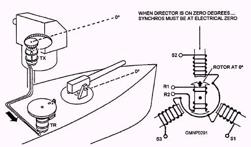 Figure 5-28.-System zero. Electrical zero is the reference point for alignment of all synchro units. The mechanical reference point for the units connected to the synchros depends upon the particular application of the synchro system. As a GM on board ship, your primary concern with the mechanical reference point will be the centerline of the ship for gun train and the standard reference plane for gun elevation. Remember that whatever the system, the electrical and mechanical reference points must be aligned with each other. Atypical example of proper alignment is a TX-TR synchro team coupled to a gun director, so adjusted that the gun position can be read on the TR dial. The gun director is at zero when the gun points directly toward the bow of the ship (fig. 5-28). A TX is coupled mechanically to the director, and a TR is connected electrically to the TX. If this system were setup without paying any attention to the position of the TX rotor, it would indicate the gun position accurately if the TR dial were set on zero when the gun director read zero. If the same synchros remained in the same system, it would not be necessary to position them more accurately. Sometimes TRs and TXs become defective and must be replaced. If another TX were put into this system without checking the TR dial, its rotor probably would be positioned differently from that of the original TX. The TR would follow the new TX, and the TR dial would read incorrect y. To overcome this difficulty, a zero degree point is needed, which is standard for all synchros. In the preceding example of the gun director, the system first should have been aligned so that all synchro rotors were at electrical zero, and all dials read zero when the gun director was on zero degrees. Then, any synchro could be replaced, without introducing error into the system, by installing the new synchro with its rotor on electrical zero when the gun director was on zero degrees. The electrical zero provides a standard way of aligning synchro units when they are connected together in a synchro system. There are two ways this alignment can be accomplished. The most difficult way is to have two GMs, one at the transmitter and one at the receiver or control transformer, adjust the synchros while talking over sound-powered telephones or some other communication device. The better way is to align all the synchros to electrical zero. Units may be zeroed individual y and only one GM is required to do the work. Another advantage of using electrical zero is that trouble in the system always shows up in the same way. For example, in a properly zeroed TX-TR system, a short circuit from S2 to S3 causes all receiver dials to stop at 60 degrees or 240 degrees. In summary, zeroing a synchro means adjusting it mechanically so that it will work properly in a system where all other synchros are zeroed. This mechanical adjustment is accomplished normally by physically turning the synchro rotor or stator. |