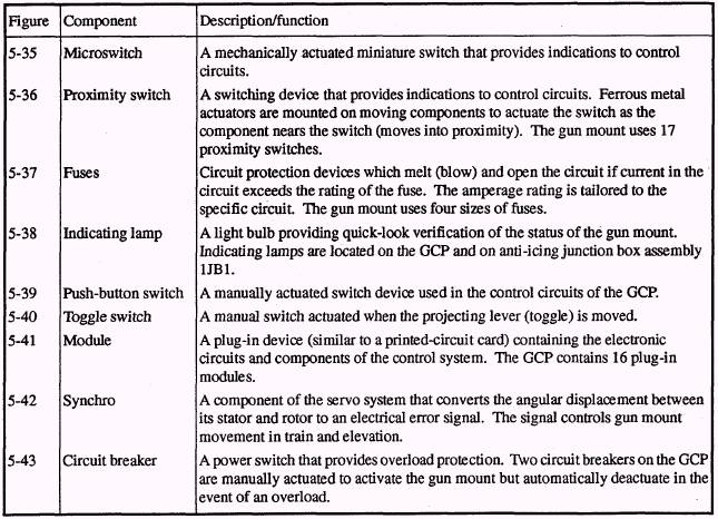 Table 5-10.-Control System Components Likewise, for any component designation beginning with a number, the number indicates its general location on the gun mount. A designation beginning with a "1" indicates the component is mounted on a bulkhead; "2" indicates the component is located on the training mass; "3" indicates the component is located on the elevating mass; and "4" indicates the component is mounted on the weather shield. |