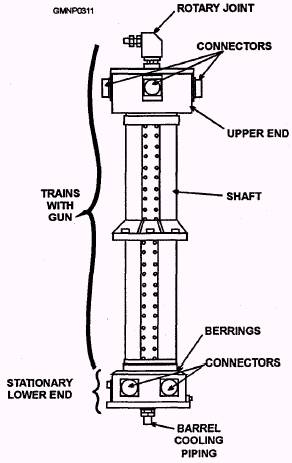 GUN MOUNT CABLING Electrical cabling and barrel cooling piping extending into the gun mount are routed through the slip ring assembly. The slip ring assembly, through the use of rotating electrical contacts and a rotary pipe joint, allows unlimited training of the gun mount. SLIP RING ASSEMBLY The slip ring assembly (fig, 5-48) provides continuous electrical connections between the cabling of the stationary structure of the gun mount and the cabling of the training mass. The slip ring assembly also contains a rotary joint for the barrel cooling system piping. The slip ring assembly extends up the center of the gun mount. The lower end of the slip ring assembly contains plug-in connectors for the cabling on the stationary structure. The lower end of the slip ring assembly is prevented from rotating by guides mounted to the deck which engage a retaining lug on the slip ring. The shaft and upper end of the slip ring assembly rotate with the gun mount in train. The upper end contains plug-in connectors for the electrical cables on the rotating structure. When the gun mount moves in train, the upper end and the shaft of the slip ring rotates