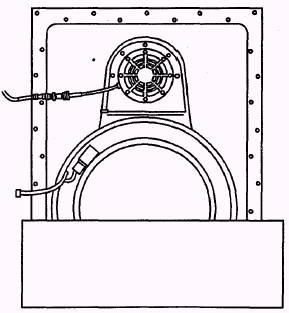Figure 5-49.-Exhaust fan (inside view). WARNING Fumes resulting from gun firing contain hydrogen, carbon monoxide, and other toxic gases which are potential health hazards. The proper operation of the gun mount ventilation system is imperative when firing the gun. Illumination inside the gunhouse is provided by two fluorescent light fixtures (fig. 5-50) mounted on the inside of the weather shield. One fixture is on the left side of the gun mount; the other is on the right side. Each light fixture contains three fluorescent tubes. The two outer tubes are connected to the white light supply of the ship. The center tube has a red sheath over it and is connected via the GCP to the red light supply of the ship. The red lights are on at all times. The white lights are on when the white light supply of the ship is on and when two interlock switches are actuated. Circuit protection for the gunhouse lighting system is provided by circuit breaker CB4 in the bottom compartment of the GCP. One of the interlock switches, the mount hatch closed switch 4S 1, is a manually actuated switch located inside the entry hatch. In normal operation, however, switch 4S 1 is actuated when the entry hatch is closed. The other interlock switch, mount white lights, on switch 4S2, is a manually actuated switch located inside the weather shield on the right side