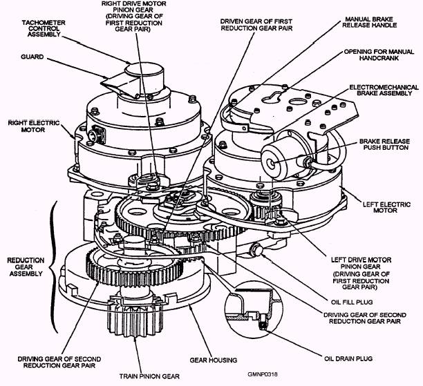 ELECTRIC MOTORS The train system uses two electric motors (fig. 5-55) to drive the reduction gear assembly and move the gun in train. The electric motors are lightweight (25 kg) low-inertia, dc motors with permanent magnet fields and printed disk rotors. The rated output of each motor is 3 kW at 3,000 rpm. The left electric motor (No. 1) has an electromechanical brake assembly installed on the top of its output shaft. The brake assembly consists of an electromagnet, a braking disk, and a rotating disk splined to the motor output shaft. With no power applied to the brake, steel springs around the top of the electromagnet push the braking disk up. When power is applied to the brake, the electromagnet pulls the braking disk down (compressing the springs) and releases the rotating disk. The electromagnet remains energized, and the brake remains released as long as power is applied to the brake. The brake has a manual release handle for power-off operation. It also has a push button for use with a manual hand crank, The pushbutton releases the brake only when the servo system power is on and the hand crank is installed. The hand crank fits into an opening in a bracket on top of the brake. The hand crank is used to train the gun mount manually during maintenance and power-off operations. A proximity switch, mounted under the bracket, turns on the TRAINING HAND CRANK IN