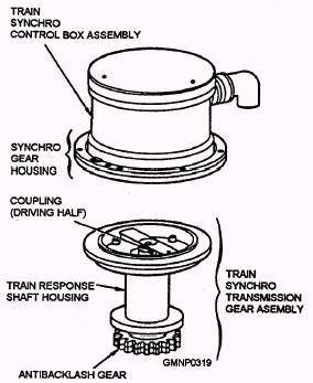 Figure 5-56.-Train synchro control box assembly and transmission gear assembly. Train Synchros As the gun moves in train, the train response shaft rotates the synchros through the synchro gearing in the bottom of the train synchro control box. The antibacklash gears and the couplings ensure that the rotation of the synchros exactly matches the train movements of the gun mount. Three of the train synchros are control transformers (CTs). Two CTs receive position signals from the FCS and generate error signals-the third is a spare. The error signals, when amplified and processed by the motor control circuity, regulate the current applied to the train motors. One of the Cts (1X) is for coarse control (error signal greater than 1.5 degrees); the other CT (36X) is for fine control (error signal less than 1.5 degrees). In addition to the 1X and 36X CTs, the train synchros include two torque transmitters (Txs) and five control transmitters (CXs). The 1X TX continuously transmits the train position to FCS and to a torque receiver synchro at the GCP. The torque receiver synchro operates the train position indicator dial. The 180X TX continuously transmits a superfine indication of train position to FCS.