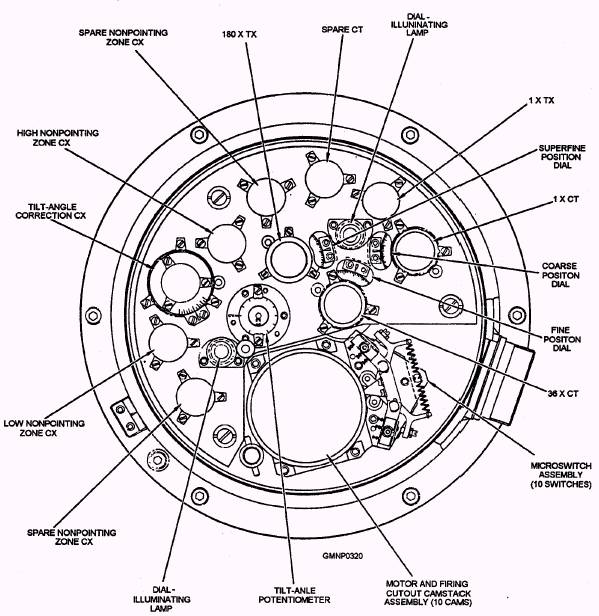 Figure 5-57.-Train synchro control box components. One of the five CXs is for tilt-angle correction. This CX adds error through the tilt-angle potentiometer to the output of the elevation 36X CT. The error is based on the tilt-angle difference between the roller path of the gun mount and the master level of the ship. Of the remaining four Cxs, one is for the high nonpointing zone, one is for the low nonpointing zone, and the other two are spares. The outputs of the nonpointing zone Cxs are used to temporarily override training orders. This output prevents the barrel from training into a nonpointing zone until it elevates over the zone. Tilt-angle Potentiometer The tilt-angle potentiometer adjusts the intensity of the correction signal from the tilt angle correction CX. This adjustment is made during installation. It compensates for any angular difference between the plane of the gun mount and the plane of the master level of the ship. The tilt-angle potentiometer can correct an angular difference up to 10 minutes. On ships outfitted with the FCS Mk 92, the potentiometer is set at 0 and is locked down since the computer makes this correction directly. |