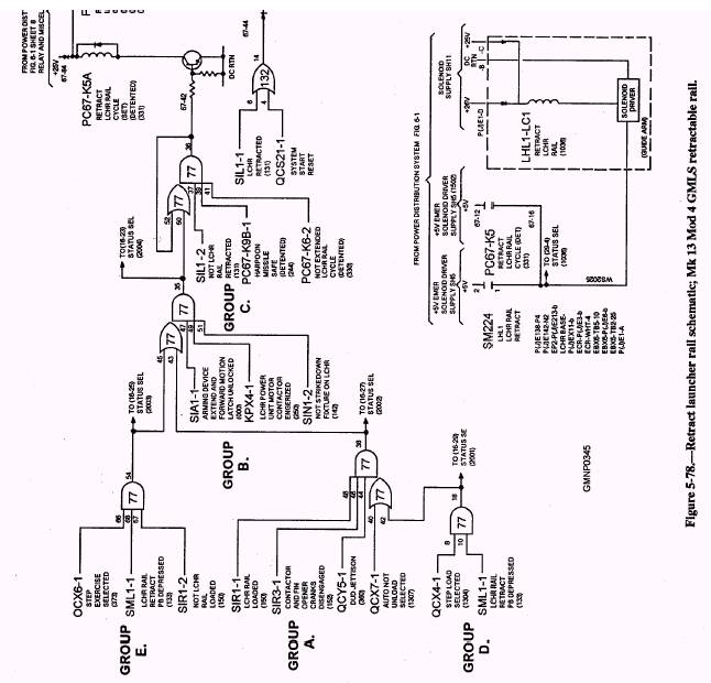 RETRACT LAUNCHER RAIL Retracting the launcher rail during a missile firing does not (directly) involve the solid-state circuit in figure 5-78. After the rocket motor of the missile ignites, the round travels about 20 inches up the rail. The forward missile shoe contacts the retract trigger located on the underside of the rail. The trigger shifts (or cams) a valve to start the hydraulic-mechanical actions that move the rail. The rail retracts to provide clearance for the tail-control surfaces of the missile as the round leaves the launcher. However, in dud jettison, step-load, or exercise operations, the solid-state circuit is directly involved in initiating a retract cycle. Solid-state interlocks are used to ensure equipment conditions are correct before energizing the retract launcher rail solenoid LHL1-LC1. The solenoid, located in the guide arm, then initiates the hydraulic-mechanical actions to retract the rail. Auto-Not-Unload Circuit (Jettison) The auto-not-unload circuit is the primary signal path used to retract the launcher rail. The object of this circuit is to energize relay coil PC67-K5A, RETRACT LAUNCHER RAIL CYCLE (SET) (DETENTED). When the A- or set-coil energizes, the PC67-K5 contacts close. This action applies a +5-volt input signal to LHL1-LC1's solenoid driver circuit. The solenoid driver circuit activates and energizes the LC1 coil. The following logic gate inputs must be satisfied to energize PC67-K5A. They are listed (and explained) by groups for ease of presentation. Locate them in figure 5-78. GROUP A: 1. SIR1-1-Launcher rail loaded 2. SIR3-1-Contactor and fin opener cranks disengaged 3. QCY5-1-Dud jettison 4. QCX7-1-Auto-not-unload selected GROUP B: 1. SIA1-1-Arming device extended and forward-motion latch unlocked 2. KPX4-1-Launcher power unit motor contactor energized 3. SIN1-2-Not strike-down fixture on launcher GROUP C: 1. SIL1-2-Not launcher rail retracted 2. PC67-K9B-1-Harpoon missile safe (detented) 3. PC67-K6-2-Not extend launcher rail cycle (detented)