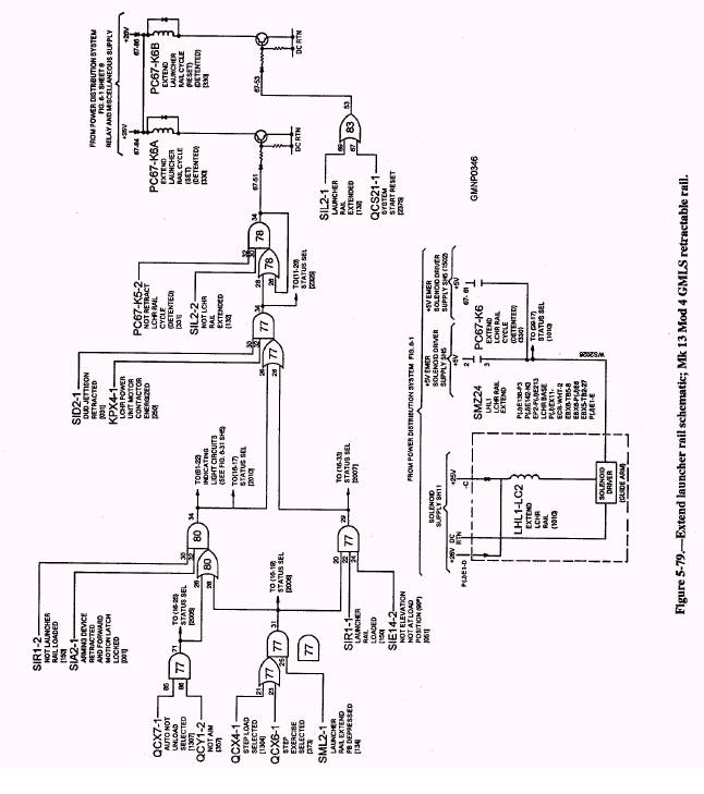 COMPLETING THE RETRACT CYCLE.- When the launcher rail is fully retracted, proximity switch SIL1 activates. The 1 and 2 outputs from its inverter-buffer affect the retract circuit in two ways. First, the SIL1-2 input (Group C) to OR-AND gate 77-39 now goes low. The change in input status produces a low output at 77-36. The low-output signal turns off the NPN transistor and de-energizes PC67-K5A relay coil. Since it is a detented relay, its contacts remain closed to the LHL1-LC1 solenoid driver. The second result of SIL1 activating affects OR-gate 132-6. Its SIL1-1 input now goes high. The output signal produced at 132-14 goes high. It turns on the other NPN transistor (67-44) that energizes the PC67-K5B relay coil. This coil, being the reset coil of PC67-K5, causes the contacts of the relay to open. The high input to the solenoid driver of LHL1-LC1 is thereby removed. The solenoid de-energizes and returns to neutral. The other input to OR-gate 132 is QCS21-1, system start reset. This input is high whenever summary circuit QCS21 is activated. The purpose of summary circuit QCS21 is related to safety. It is activated during system start or turn on procedures. When activated, QCS21 produces a high output. This signal is supplied to every reset coil of all the guide arm component relays. Energizing each reset coil prevents the accidental movement of equipment. After initial light off and when the system is ready to operate, QCS21's output goes low. Step-Load Circuit The step-load circuit centers around the two inputs of Group D in figure 5-78. The circuit is used to retract a loaded launcher rail if jettison operations must be performed in step control. Therefore, many of the conditions of an auto-not-unload mode must still be satisfied for the step-load cycle. When the console operator changes modes, the QCX7-1 (Group A) input to 77-40 goes low. This change effectively disables the entire retract circuit and PC67-K5A cannot be energized. As the console operator switches into step-load, the QCX4-1 (Group D) input to AND gate 77-8 goes high. This action only satisfies one of the required inputs to the circuit. To retract the launcher rail, the console operator depresses push button SML1. The switch provides an input signal to its buffer circuit. The unflagged output line of the circuit goes high. The high SML1-1 input applied to 77-10 activates the AND gate. It provides a high output at 77-18. This signal satisfies the OR-AND gate's (Group A) inputs and the launcher rail retracts. Step-Exercise Circuit The step-exercise circuit centers around the Group E inputs on figure 5-78. When the three input conditions to the Group E AND gate are satisfied, a high is produced at 77-54. The high is applied to 77-45 of the OR-AND gate in Group B. The remaining circuit inputs and operations are the same as a step-load cycle. Notice that all Group A inputs are low at this time and are not used. Take a minute to review the various retract cycles performed by this solid-state control circuit. It is important that you understand the principles involved. EXTEND LAUNCHER RAIL The launcher rail automatically extends following missile firing or jettisoning operations. After the rail is empty, the aft-motion latch and arming device retract. The forward-motion latch also locks in place. These, and other conditions, complete the auto-not-unload circuit to energize extend solenoid LHL1-LC2. The hydraulic-mechanical actions are then initiated to re-extend the rail. In step-load and exercise modes, depressing the extend push button initiates the circuit to energize LHL1-LC2. We will not go into a detailed analysis of the extend circuit shown in figure 5-79. It is very similar to the retract circuit in terms of logic gate operation and sequence of events. Refer to figure 5-78 as the following paragraphs describe the various signal paths. Auto-Not-Unload Circuit The following logic inputs are involved with the extend auto-not-unload circuit. Locate them and trace their outputs on figure 5-79. 1. QCX7-1-Auto-not-unload selected 2. QCY1-2-Not aim 3. SIR1-2-Not launcher rail loaded 4. SIA2-1-Arming device retracted and forward-motion latch locked 5. SID2-1-Dud jettison retracted 6. KPX4-1-Launcher power unit motor contactor energized 7. PC67-K5-2-Not retract launcher rail cycle (detented) 8. SIL2-2-Not launcher rail extended 9. SIL2-1-Launcher rail extended 10. QCS21-1-System start reset When the first eight inputs in the above list are satisfied (high), PC67-K6A will energize. Its contacts close to activate the solenoid driver circuit. LHL1-LC2 solenoid coil energizes and the launcher rail extends. When the rail is extended, proximity switch SIL2-1