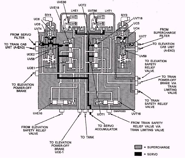 SERVO AND SUPERCHARGE PUMP.- The servo and supercharge pump is mounted on the aft end of the right trunnion support and is driven by the elevation electric motor. This dual output gear pump supplies servo fluid to control both CAB units (train and elevation) and also the supercharge fluid to replenish the CAB unit slippage. AUXILIARY RELIEF VALVE BLOCK.- The auxiliary relief valve block (fig. 6-6) is mounted in the middle of the right trunnion support. Its purpose is to limit supercharge fluid pressure to 150 psi, limit servo fluid pressure to 450 psi, control the operation of the power-off brake, indicate by means of switches the availability of supercharge and servo fluid pressures, and provide a flow of fluid to cool the elevation and train the CAB units. When the elevation electric motor is started, filtered supercharge fluid enters the valve block through check valve UV77 and is ported to the center of supercharge pressure relief valve UV59. From UV59, it ports to the train and elevation safety relief valves to replenish the transmission lines. As supercharge fluid builds up to its normal operating pressure of 150 psi, it forces UV59 downward against its spring and, through orifice UO4, forces supercharge pressure switch piston UC5 upward against its spring. When supercharge fluid reaches 150 psi, UC5 activates switch SIY3 indicating that supercharge fluid pressure is normal and, at the same time, UV59 moves down and opens a port that bypasses part of the supercharge fluid to the elevation CAB unit.