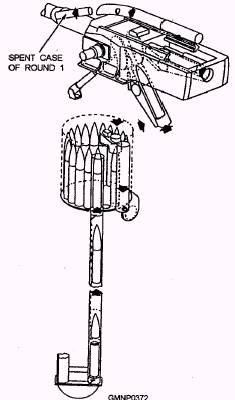 Figure 6-23.-The gun fires and recoils. This completes one firing cycle. The loading system continuously keeps each station full as rounds are fired. |