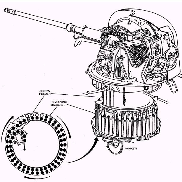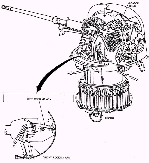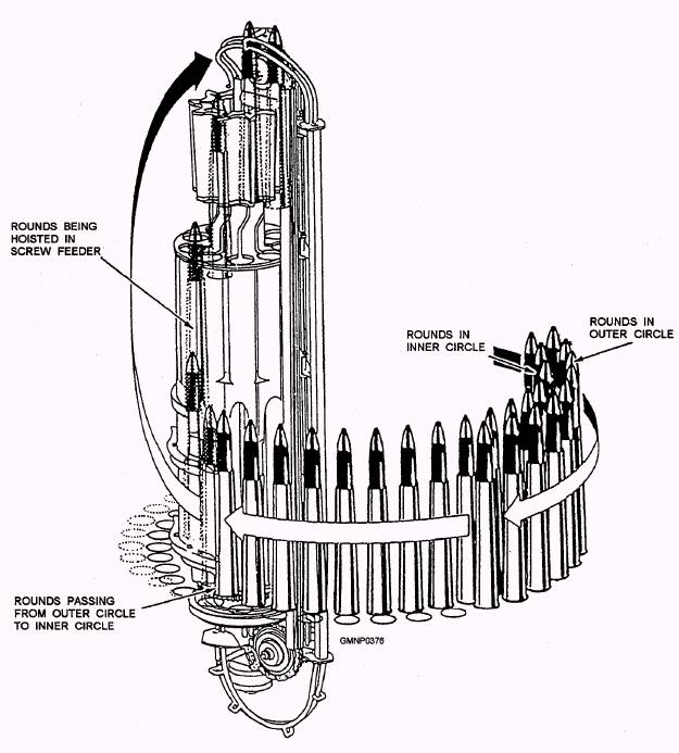 Figure 6-29.-Ammunition flow from the revolving magazine through the screw feeder. raise rounds to the loader drum (fig. 6-30). While one rocking arm is lifting a round to the loader drum, the other arm is returning empty to pick up the next round from the screw feeder. The loader drum has a capacity of four rounds. As the loader drum receives around from the rocking arm, it rotates to deposit the round in the last station of the loader drum and then into the transfer tray for subsequent ramming and firing (fig. 6-31). The Mk 75 gun system uses a percussion firing system. During recoil, the breechblock is lowered and the empty case is extracted into the empty case tray from which it is ejected out of the system. This completes the loading cycle for one round.