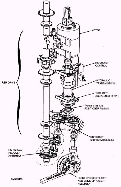 Figure 7-26.-RSR/hoist power drive. exercise/maintenance purposes. This system is hydraulically part of the RSR/hoist main accumulator system. However, it uses a smaller electric motor and pump to deliver a reduced hydraulic fluid pressure to the magazine components and the train power drive. LAUNCHER The launcher consists of all the components necessary to receive missiles from the magazine and prepare them for launching. A rectangular plate about 18 feet long and 10 feet wide, called the platform, supports the carriage and two dud-jettison devices. It also provides mounting surfaces for the blast doors, span rails, and some train drive components. The carriage supports the guide arms and consists of various components, as shown in figure 7-27. The stand is secured to the platform and serves as a stationary support structure. The base ring fits inside the stand and rotates on two sets of bearings. Ball bearings near the top of the stand support the weight of the rotating launcher. Roller bearings near the bottom of the stand hold the base ring in vertical alignment. The trunnion support is a boxlike structure mounted to the top of the base ring. It supports the trunnion tube on ball- and roller-bearing assemblies. It also houses the elevation drive and other hydraulic components. The electrical contact ring is located within the base ring area. It transmits electrical power and anti-icing fluid between the stationary and rotating parts of the launcher. |