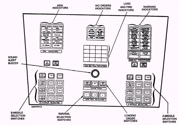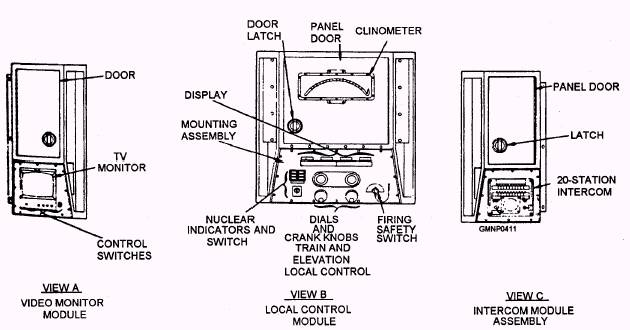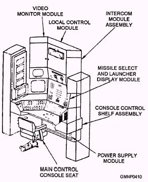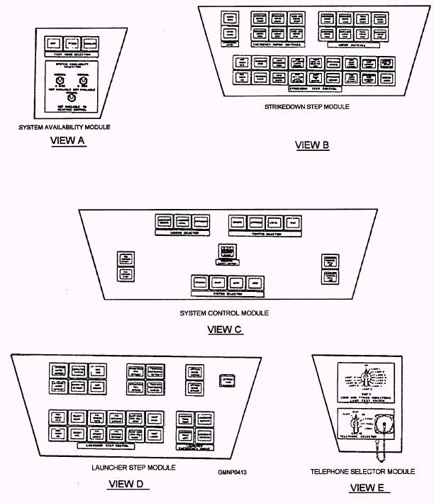 MAIN CONTROL CONSOLE (MCC).- The MCC (fig. 7-31) is a modular, wraparound type of unit. It contains the operating controls and indicators needed for programming and monitoring launching system operations. The individual modules in the MCC are shown in separate figures for clarity. The video monitor module (fig. 7-32, view A) consists of electrical components and a TV screen used for watching either the launcher area or rear magazine areas. The local control module (fig. 7-32, view B) is used by the MCC operator as the local control station for the train and elevation power drives. Also provided are a firing safety switch, rail and system nuclear lock indications, and digital readout displays of both launcher ordered and actual positions. This module acts as a communication link between the DST and other ICS equipments. The intercom module assembly (fig. 7-32, view C) has a 20-station intercom to other parts of the ship. A small compartment can store a set of sound-powered phones for the MCC operator (plus a deck of cards,