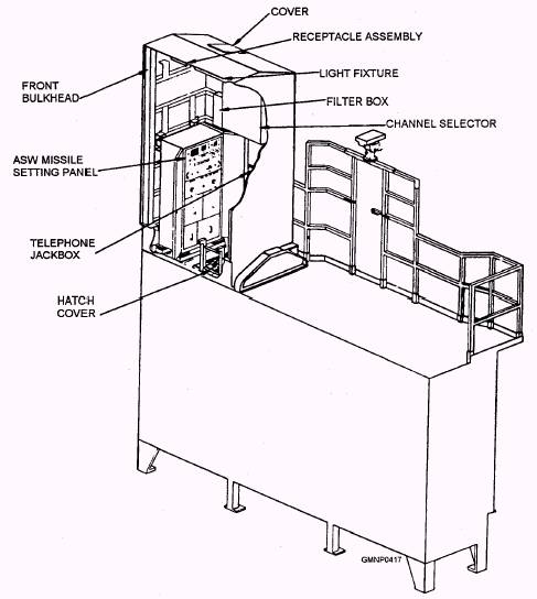 Figure 7-38.-Personnel access trunk. 7-42 We will now discuss the physical and functional characteristics of the Mk 41 Mods 0, 1, and 2 VLSs. The Mk 41 Mod 0 VLS is used with the AEGIS, Tomahawk, and underwater weapon systems onboard CG-47 and CG-52 and up class ships. The Mk 41 Mod 1 is used with the Tomahawk and underwater weapon systems onboard DD-963 class ships. The Mk 41 Mod 2 is used with the AEGIS, Tomahawk, and underwater weapon systems onboard DDG-51 class ships. DESCRIPTION AND CAPABILITIES The VLS (figs. 7-39, 7-40, and 7-41) is a multipurpose launching system that can load/accept, stow, select, prepare for launch, and launch the Standard missile Type 2 (SM-2), the Tomahawk cruise missiles, and the vertical launch antisubmarine rocket (ASROC VLA) against air, surface, land, or subsurface targets. The missiles are contained in separate sealed canisters that are installed vertically below deck in