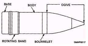 Figure 2-2.-external features of a typical gun projectile. one or two aft, the after one being located adjacent to and either forward and/or aft of the rotating band. Bourrelets are painted to prevent rusting. BODY.- The body is the main part of the projectile and contains the greatest mass of metal. It is made slightly smaller in diameter than the bourrelet and is given only a machine finish. ROTATING BAND.- The rotating band is circular and made of commercially pure copper, copper alloy, or plastic seated in a scored cut in the after portion of the projectile body. In all minor and medium caliber projectiles, rotating bands are made of commercially pure copper or gilding metal that is 90 percent copper and 10 percent zinc. Major caliber projectile bands are of cupro-nickel alloy containing 2.5 percent nickel or nylon with a Micarta insert. As a projectile with a metallic band passes through the bore of the gun, a certain amount of copper will be wiped back on the rotating band and will form a skirt of copper on the after end of the band as the projectile leaves the muzzle of the gun. This process is known as fringing and is prevented by cutting grooves, called cannelures, in the band or by undercutting the lip on the after end of the band. These cuts provide space for the copper to accumulate. The primary functions of a rotating band are: 1. To seal the forward end of the gun chamber against the escape of the propellant gas around the projectile, 2. To engage the rifling in the gun bore and impart rotation to the projectile, and 3. To act as a rear bourrelet on those projectiles that do not have a rear bourrelet. BASE.- The base is the after end of the projectile. A removable base plug is provided in projectiles that are loaded through this end. A fuze hole maybe drilled and tapped in the center of this base plug. Projectiles with large openings in the nose for loading through that end require no base plug. In such cases, however, the solid base of the projectile may be drilled in the center to receive abase fuze or tracer if desired The edge formed by the sidewalls and the base is usually broken slightly to give additional range. Some projectiles are tapered aft of the rotating band, a shape known as boat tailed. Projectiles with plastic bands may have full caliber boat tails for optimum aerodynamic shape. |