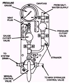 Figure 8-32.-Remote control panel. recesses or holes allow the valve to be locked in any of its three positions. Installed between the handle and the lever is a rectangular locking key. The key is secured in place by easily broken safety wire (lead-wire seal). The locking key prevents accidental sprinkler activation since the handle and lever cannot be squeezed together with the key in place. If they cannot be squeezed, the locking pin cannot be retracted and the handle will not turn. INLINE CHECK VALVES.- Four inline check valves, designated Cla-Val No. 81M, are located on the local control board. (See fig. 8-28.) They are spring-loaded check valves that open wide when salt water flows in the proper direction (with the arrow). They close tight when salt water flows against the arrow. By preventing backflow to other stations, these check valves permit the sprinkler system to be activated from more than one station. HYDRAULICALLY OPERATED CHECK VALVE.- The hydraulically operated check valve is designated Cla-Val No. 81PM-1 (fig. 8-28). It is a normally closed, globe-type check valve that becomes functional only during the stop cycle of sprinkler operation. When fire main is ported to the upper chamber of the valve, its diaphragm lifts and opens the bottom chamber. Fire main from the top of the main sprinkler control valve is then ported out unrestricted to drain line #3. This action permits the main valve to close under spring pressure, which secures sprinkler operation. DRAINS AND ORIFICES.- The hydraulic control system has three drain lines and two orifice restrictions (fig. 8-28). The drain lines are normally located so that they can discharge into a portable container (bucket). The lines should be numbered and tagged so that they can be quickly identified. Drain lines #1 and #2 contain .098-diameter-orifice plates. The orifices (holes), drilled through flat metal plates, serve two purposes. The primary purpose of the orifices is to prevent a buildup of saltwater back pressure in control system piping. Back pressure is normally caused by valve leakage. Eventually, this back pressure could be enough to activate the system. On your daily magazine inspection, you will notice a puddle of water on the deck or in the bucket. Report it so that repairs can be made. The secondary purpose of the orifices is to vent operating pressure from the hydraulic control system when it is returned to AUTO or NEUTRAL. Main Sprinkler Control Valve The main sprinkler control valve is located inside the magazine. The valve (fig. 8-33) is a diaphragmoperated, normally (spring) closed, globe-type valve. The upper diaphragm in the bonnet chamber is raised or lifted by a minimum of 40-psi fire main pressure. As it lifts, the lower disc is pulled off its seat. Fire main supply is then free to flow to the sprinkler heads. The upper end of the valve stem can be seen in a glass sight tube. It provides a visual indication of the condition of the stem (stem down, valve closed; stem up, valve open). A removable cover is located on the bottom side of the body of the valve. Normally, the cover remains installed. During any maintenance testing or repair work, the cover is unscrewed and replaced with a special test casting (fitting). The test casting is so shaped that it extends up to the lower seat of the disc. When the disc lifts, the fire main is prevented from flowing to the sprinkler heads by the body of the test casting. The test casting also has a removable cap. When unscrewed, it may be replaced by a standard fire hose and fitting. After the system activates, the fire main flows through the hose and is discharged over the side. This process flushes the saltwater piping of the hydraulic control system. The test casting MUST be installed before any work is performed on the sprinkler system. The test casting MUST be removed after the job is completed. These two "rules" are extremely important. |