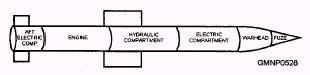 Figure 9-1.-Sectionalization of a missile. must be as light and compact as possible, yet strong enough to carry all the necessary components. The structure must also be able to withstand the forces to which it will be subjected. These "forces" will be encountered during preflight shipping, handling, and stowage periods. Other forces, such as gravity, heat, pressure, and stresses of acceleration, will also be experienced in flight. In most missiles, the main body is a slender, cylindrical structure capped on either end by nose and tail sections. Several types of nose sections can be used (fig. 9-2). If the missile is intended to fly at supersonic speeds (greater than the speed of sound), the forward (nose) section usually is designed with a pointed-arch profile. The sides taper in lines called "ogive" curves. With missiles intended for subsonic speeds, the nose is often not as sharp or even blunt. The forward section of most SMS missiles is covered by a "radome." This type of nose protects a small radar antenna inside the missile. Typical structures (airframes) contain a main body that terminates in a flat base or tail cone. When the contour of the tail cone is slightly streamlined at the rear, it is said to be "boattailed." Attached to the body (also known as the skin or outer surface) are one or more sets of airfoils. These airfoils (wings, fins, or control surfaces) contribute to in-flight stability, provide lift, and control the flight path of the missile.