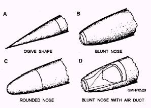 Figure 9-2.-Missile noses. The design configuration of a particular missile depends on various factors. Consideration must be given to the speed, the operating range, and the turning rate of the missile. 'The purpose of the missile and the medium(s) through which the round will travel (such as water, air, or a combination of the two) are other important factors. The location of the primary control and/or lifting surfaces also determines the configuration of the missile. Two popular designs are wing-control and tail-control missiles (fig. 9-3). Wing-control airfoils are mounted at or near the center of gravity of the structure. Tail-control airfoils are located at the rear of the missile. Most SMS missiles have dorsal fins and tail-control surfaces (fig. 9-4). The dorsal fins are attached to the main body of the missile. These stationary surfaces are used to provide stability and (some) lift during missile flight. The tail-control surfaces normally are folded during stowage. These surfaces are erected (unfolded) just before launch. The tail-control surfaces are turned or pivoted to control (steer) the missile along its flight path. |