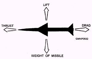 Figure 9-4.-Missile configurations. of air and other gases. It also considers the forces acting on bodies moving through these gases. The principles of aerodynamics that apply to the operation of most aircraft also apply to high-speed missiles. AERODYNAMIC FORCES The principal forces acting on a missile in level flight are thrust, drag, weight, and lift. Like any force, each of these is a vector quantity that has magnitude and direction. These forces are shown in figure 9-5. Thrust is directed along the longitudinal axis of the missile is the force that propels the missile forward at speeds sufficient to sustain flight. Drag is the resistance offered by the air to the passage of the missile through it. This force is directed rearward. Weight is comparable to the force of gravity acting on missile. This force is directed downward to the center of the Earth. Lift is an upward force that supports the missile in flight. Lift opposes the force of gravity and is directed perpendicular to the direction of drag. Lift is the force that concerns us the most.