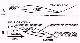 Figure 9-5.-Forces acting on a moving missile. Lift is produced by means of pressure differences. The primary requirement for lift is that the air pressure on the upper surface of an airfoil (wing or fin) be less than the pressure on the underside. The amount of lifting force produced is dependent, to a large extent, on the shape of the airfoil. Additional factors also determine the amount of lift. The airfoil area and the angle at which its surface is inclined to an airstream affect lift. The air speed and air density passing around the airfoil are two more factors. The airfoil that provides the greatest lift with the least drag in subsonic flight has a curved (or camber) shape (fig. 9-6). Some standard airfoil terms are also included in the drawing on figure 9-6. The foremost edge of the airfoil is the leading edge. The rear edge is the trailing edge. A straight line between the leading and trailing edges is the chord. The large arrow (in view B) indicates relative wind or the direction of airflow in respect to the moving airfoil. The angle of attack is the angle between the chord and the direction of relative wind. As relative wind strikes the airfoils tilted surface, air flows around its upper and lower surfaces. Different amounts of lifting force are exerted on various points of the airfoil. The sum of all these forces is equal to a single force acting on a single point and in a particular direction. This point is the center of pressure. From here, lift is in a direction perpendicular to relative wind. The dynamic or impact force of the relative wind against the airfoils lower surface contributes to lift. However, the major portion of the lifting force is obtained from the pressure differential above and below the airfoil. The angle of attack causes the air flowing over the airfoils upper surface to travel a greater distance. The farther the air has to travel, the faster it moves. Faster speed creates a lower pressure. Therefore, since the air pressure above the airfoil is less than that below it, the result is lift. The magnitude of the lifting force is proportional to the pressure difference.