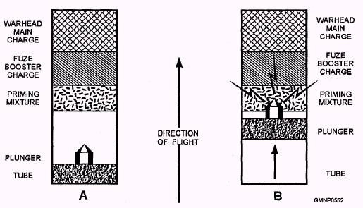 Contact Fuzes Contact or impact fuzes are actuated by the inertial force that occurs when the missile strikes the target. Figure 9-25 illustrates the action of a contact fuze before and after impact. (The booster charge and main charge are not part of the fuze.)