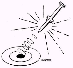 Figure 9-25.-Contact fuze action: A. Before impact; B. After impact. During the launch and flight of the missile, the plunger remains in the after end of the fuze. When the missile strikes the target, it decelerates rapidly. The inertia of the plunger carries it forward to strike the sensitive priming mixture. The primer detonates and starts a chain reaction by igniting the fuze booster charge which ignites the main charge. Sometimes a time delay element is used with a contact fuze. This delay permits the warhead to penetrate the target before detonation. Quite often a contact fuze is also used in conjunction with another type of fuze. For example, the main fuze can be a proximity-type fuze. Should it fail to operate as the missile approaches the target, the contact fuze would still function on impact. In this sense, a contact fuze serves as a backup or secondary fuze, Proximity fuzes are actuated by some characteristic feature, influence, or property of the target or target area. Several types of proximity fuzes are available. The influence may be photoelectric, acoustic, pressure, electromagnetic (radio and radar), or electrostatic. Each of these influences could be preset to function when the intensity of the target characteristic reaches a certain magnitude. Proximity fuzes are designed to initiate warhead detonation as the missile approaches or nears the target. The resulting burst pattern occurs at the most effective time and location relative to the target. Designing a fuze to produce an optimum burst pattern is not that easy. The most desirable pattern depends largely on the relative speed of the missile and of the target. Sometimes the fire control computer (during preflight programming) can adjust the sensitivity of the fuze. This action can compensate for varying target speeds and sizes. (We'd want a more sensitive fuze for a small target compared to a less sensitive fuze for a larger target.) Proximity fuzes, therefore, activate the warhead detonating system after computing two factors: (1) the distance to the target and (2) the rate at which missile-target range is closing. Since a proximity fuze operates on the basis of information received from the target, it is subject to jamming. If jammed, the fuze could become inoperative. The missile would only damage the target if a direct hit (contact fuze) were scored. More seriously, jamming the fuze could result in premature detonation. In that case, the missile has no chance to reach the target. Most proximity fuzes use some means of electronic countermeasure or counter-countermeasure to eliminate or bypass the effects of jamming. Of all the types of influence available (i.e., photoelectric, acoustic, pressure, etc.), the electromagnetic methods (radio and radar) are most practical. The TDD (fuze) transmits high-frequency energy waves toward the target (fig. 9-26). Some of the waves are reflected from the target. Because the missile is constantly closing on the target, the reflected signal is of a higher frequency than the transmitted signal. The two signals, when mixed, will generate what is called a Doppler frequency. Its amplitude is a function of target distance. When the amplitude reaches a predetermined level, the faze is programmed to operate and warhead detonation is initiated. Ambient Fuzes An ambient fuze is one that is activated by some characteristic of the environment surrounding the target. Ambient fazes are used mainly for surface or subsurface applications. A simple example involves a hydrostatic fuze for underwater detonation. In this case, the fuze is basically a depth meter and activates when water pressure reaches a certain amount. Command Fuzes A command faze responds to some form of signal from a remote control point. In guided missiles, this type of fuze is often used to order the weapon to self-destruct. The remote control point would be the firing ship. If the trajectory of the missile goes "wild" and/or the flight path endangers friendly forces, the firing ship orders command-destruct. Other types of self-destroying fuzes are designed to actuate under certain conditions. For example, the missile can "lose sight" of the target. That may occur if some internal component malfunctions or the fire control radar ceases to transmit. Regardless of cause, the missile cannot respond to guidance data. If the